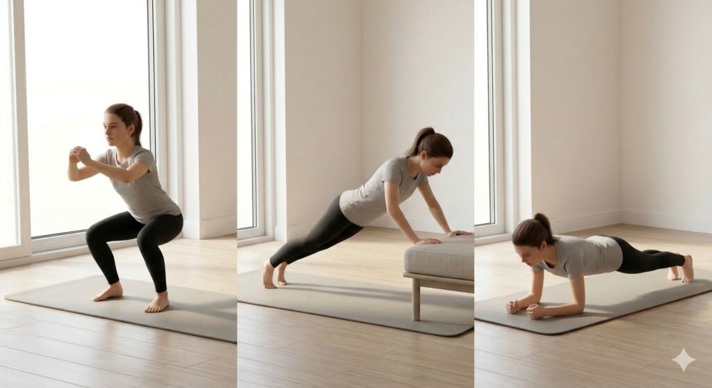 Repeat 2–3 rounds. This full body home workout for beginners builds a strong foundation.