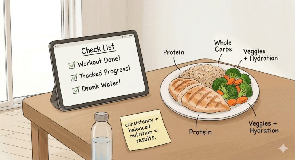 A home workout plan for beginners works best when combined with proper nutrition. You don’t need a strict diet, but healthy eating boosts your progress.