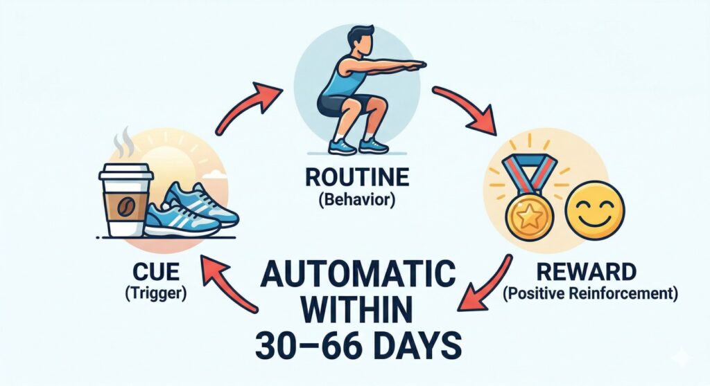 Every habit is built on three components: CUE (trigger to start), ROUTINE (the behavior itself), and REWARD (positive reinforcement). Design each of these deliberately for your workout habit and it becomes automatic within 30–66 days.