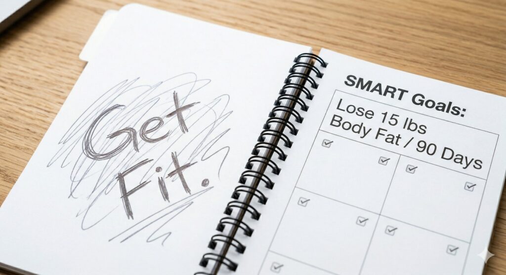 Vague goals like “get fit” produce vague results. SMART fitness goals (Specific, Measurable, Achievable, Relevant, Time-bound) create clarity and direction that fuel exercise motivation. Instead of “I want to lose weight,” write: “I will lose 15 lbs of body fat in 90 days by training 4x per week and tracking my nutrition daily.” This specific goal gives you something concrete to work toward each session.