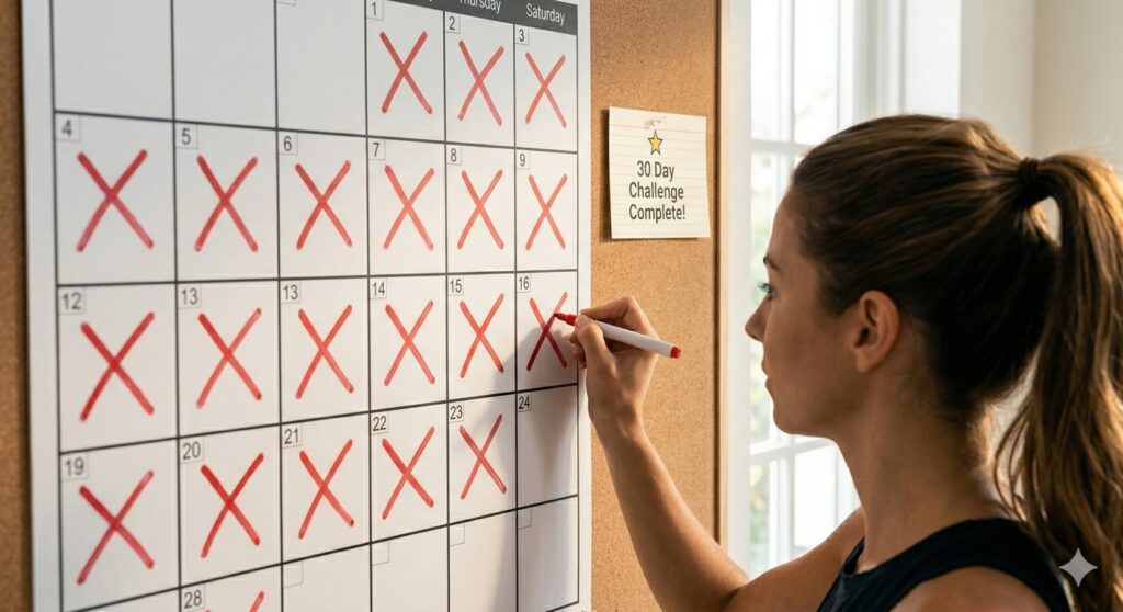 One of the top workout consistency tips is having a backup plan. When you can’t get to the gym, have a 20-minute home bodyweight workout you can do anywhere. Eliminating the “I couldn’t get to the gym” excuse keeps your streak alive. Even a 20-minute home workout maintains momentum and consistency that is worth far more than a “perfect” 75-minute gym session on three days per week.